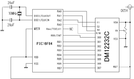 今回の使用するMPUは誰でも簡単に入手できるPIC16F84ですが、SED1520とのインターフェイスは68系モードとします。よって電源投入時はRST:Highにします。 (80系MPUを使い慣れている人であれば80系モードでいいですがRST:LOWです。インストラクションコードも変わりますので注意!)